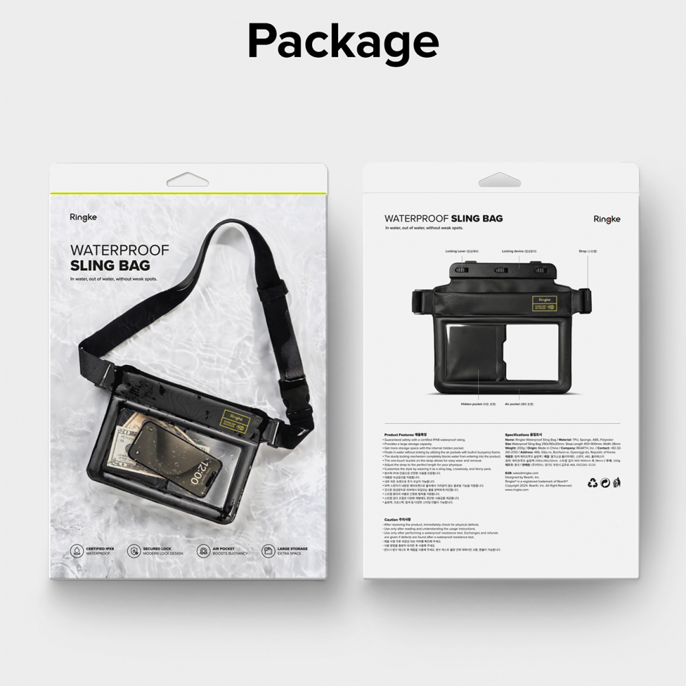 Design tašky Ringke klade důraz na praktičnost a moderní estetiku. Je vyrobena z odolného, ale zároveň lehkého materiálu, který je příjemný na dotek. Přední průhledná část umožňuje snadné ovládání dotykového displeje telefonu, aniž byste jej museli vyndávat z tašky. Bezpečný uzavírací mechanismus zajišťuje hermetické utěsnění a chrání obsah před vodou, pískem a prachem. Diskrétní logo Ringke dodává tašce punc kvality a originality.