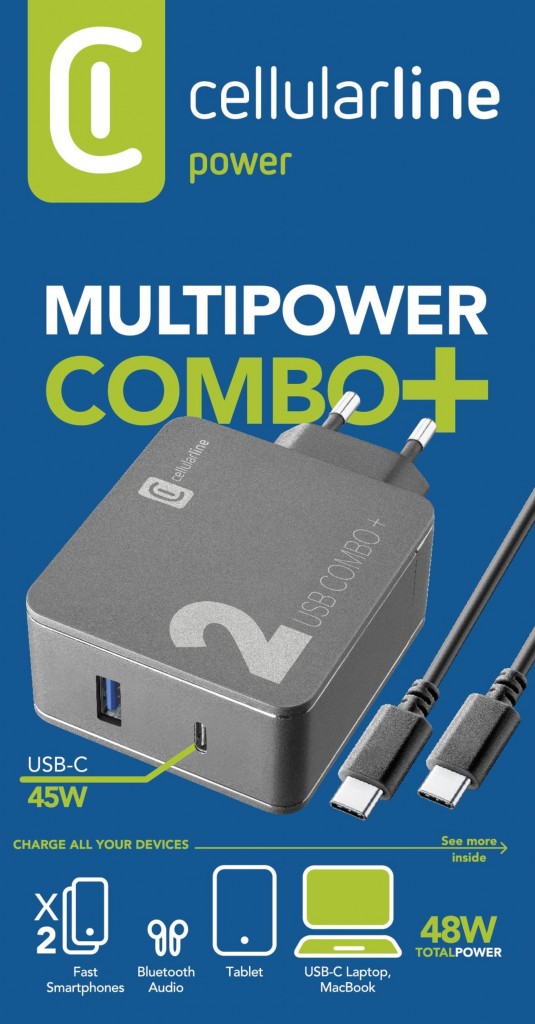 Set síťové nabíječky Cellularline Multipower 2 Combo Plus s USB a USB-C porty a USB-C kabelu je ideální pro nabíjení vašeho notebooku i chytrého telefonu současně. Pro nabíjení notebooku je určen USB-C port s technologií Power Delivery a výkonem až 45W a zvládne tak dobít i moderní notebooky HP EliteBook, Acer Swift, MacBook and MacBook Air 13’’ a další. Druhý USB port dokáže nabíjet výkonem až 18W a je ideální pro smartphony s podporou rychlého nabíjení 9V2A Fast Charge, Adaptive Fast Charge a Qualcomm Quick Charge. Po připojení zařízení adaptér automaticky rozpozná dané zařízení a zvolí tu správnou nabíjecí technologii. Díky kompaktním rozměrům a minimální hmotnosti je ideální i pro nabíjení na cestách.