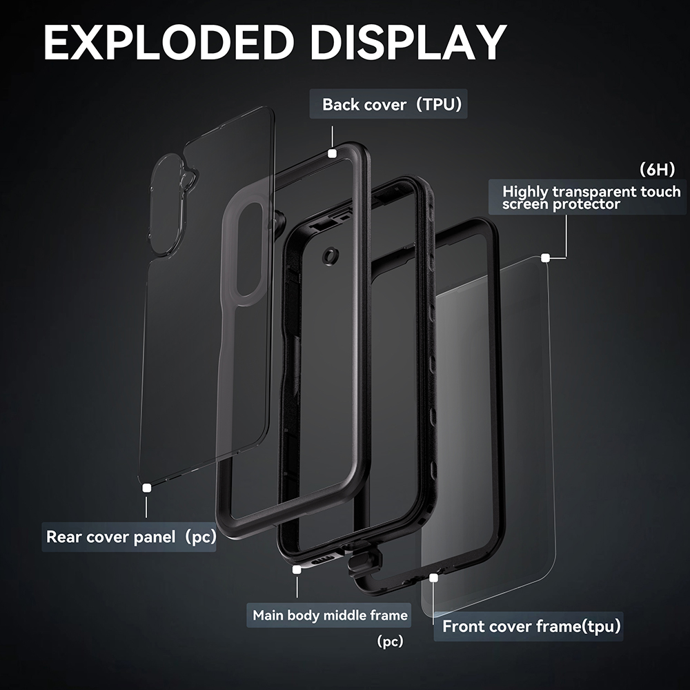 Toto pouzdro se pyšní celočerným, robustním designem, který podtrhuje jeho funkčnost a odolnost. Přední i zadní strana jsou opatřeny průhlednými ochrannými vrstvami, které umožňují plné využití dotykové obrazovky a zároveň chrání telefon ze všech stran. Zesílené rohy a boky absorbují nárazy, zatímco precizní výřezy zajišťují bezproblémový přístup k fotoaparátu a dalším funkcím. Tlačítka jsou chráněna, ale zůstávají snadno ovladatelná. Pouzdro je vyrobeno z kombinace pružného TPU (termoplastický polyuretan) pro absorpci nárazů a pevného polykarbonátu (PC) pro strukturální pevnost, což zaručuje plnou 360° ochranu včetně integrovaného chrániče obrazovky. S certifikací IP68 je pouzdro zcela vodotěsné a prachotěsné, připravené na jakékoli dobrodružství. Splňuje také vojenské standardy odolnosti proti pádu (Military Grade Drop Test), což z něj činí ideálního společníka pro extrémní sporty i každodenní ochranu.