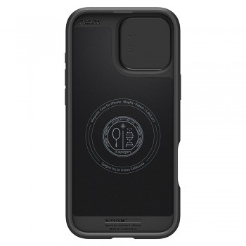 Kryt Spigen Optik Armor MagSafe se pyšní promyšleným designem, který klade důraz na maximální ochranu a uživatelský komfort. Jeho matný černý povrch s jemnou texturou nejen skvěle vypadá, ale také příjemně padne do ruky a minimalizuje ulpívání otisků prstů. Nejvýraznějším prvkem je integrovaný posuvný kryt pro modul fotoaparátu, který elegantně zapadá do celkového vzhledu a poskytuje bezkonkurenční ochranu citlivých objektivů. Zvýšené okraje kolem displeje a fotoaparátu navíc chrání tyto nejzranitelnější části telefonu před přímým kontaktem s povrchem. Precizní výřezy pro porty a tlačítka zajišťují snadný přístup a plnou funkčnost.