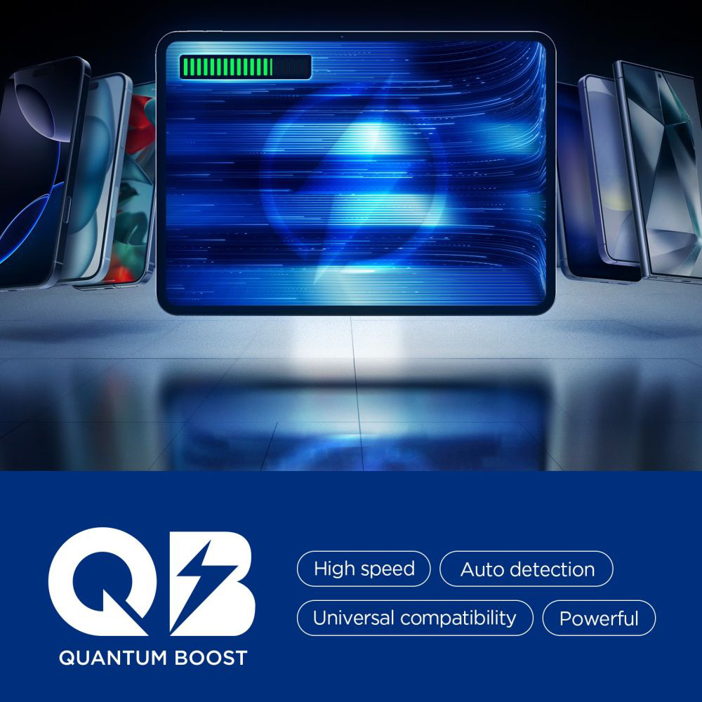 Power banka Spigen EA3030 se pyšní elegantním a minimalistickým designem v matně černé barvě, který skvěle padne do ruky i do každé tašky. Její povrch je opatřen jemnou texturou pro lepší úchop a odolnost proti poškrábání. Na vrchní straně naleznete decentní logo Quantum Boost, které podtrhuje prémiový vzhled. Díky dvěma portům USB-C (vstup/výstup s výkonem 30W) a jednomu portu USB-A (výstup s výkonem 22.5W) můžete nabíjet až tři zařízení současně, což z ní činí ideálního společníka pro moderní uživatele. Indikátory LED vás navíc vždy informují o aktuálním stavu nabití.