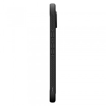 Kryt Rugged Armor MagSafe se pyšní moderním a minimalistickým vzhledem. Jeho matná černá povrchová úprava dodává telefonu sofistikovaný vzhled a zároveň zajišťuje příjemný a jistý úchop. Charakteristické karbonové textury na horní a spodní části zadní strany krytu přidávají dynamický a sportovní akcent. Precizní výřezy zajišťují snadný přístup ke všem portům a funkcím, zatímco taktilní tlačítka poskytují okamžitou odezvu. Díky integrovanému magnetickému kroužku je kryt plně kompatibilní s technologií MagSafe, což umožňuje snadné a bezpečné přichycení MagSafe příslušenství. Vnitřní strana krytu je navržena s ohledem na maximální absorpci nárazů, což je typické pro Spigen a jejich technologii Air Cushion Technology, která chrání rohy telefonu před pády.