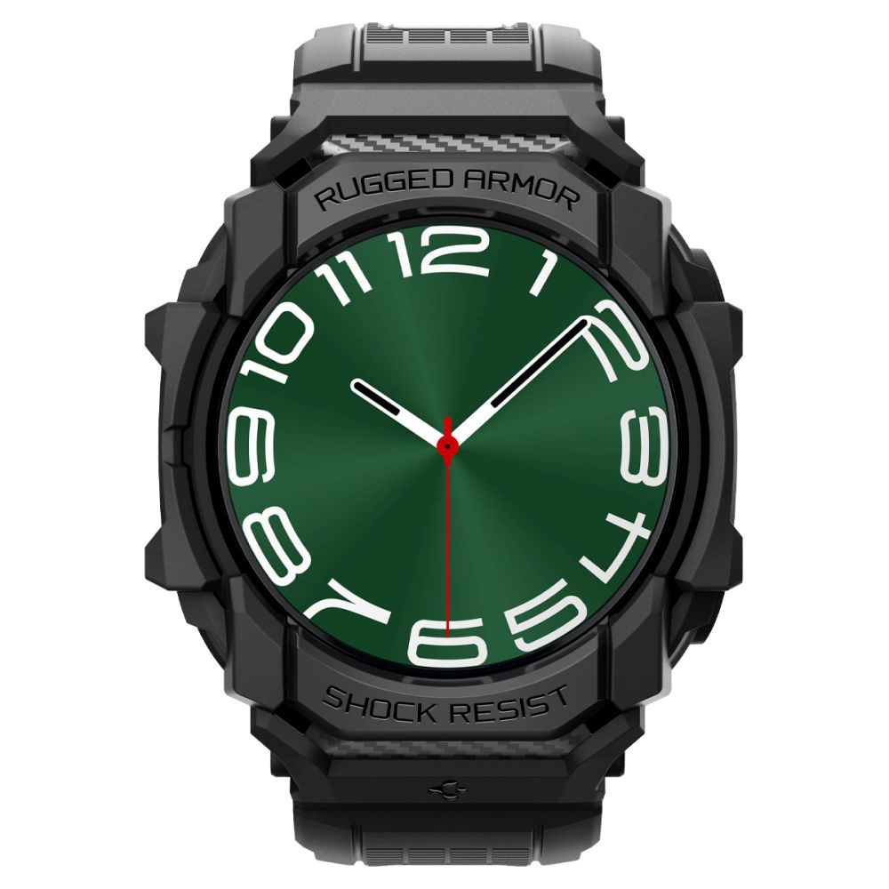 Pouzdro Spigen Rugged Armor Pro se pyšní matně černým provedením, které dodává hodinkám sofistikovaný a sportovní vzhled. Je vyrobeno z vysoce odolného TPU materiálu, který efektivně absorbuje nárazy a chrání hodinky před poškrábáním a pády. Charakteristickým prvkem jsou karbonové textury na horní a spodní části pouzdra, které dodávají produktu prémiový a dynamický vzhled. Zvýšené okraje kolem displeje zajišťují dodatečnou ochranu obrazovky před přímými nárazy a poškrábáním. Integrovaný řemínek s texturovaným povrchem a bezpečnou sponou zaručuje pohodlné nošení a snadné nastavení. Všechny výřezy pro tlačítka a senzory jsou precizně zpracované, což zajišťuje plnou funkčnost hodinek bez jakéhokoli omezení.