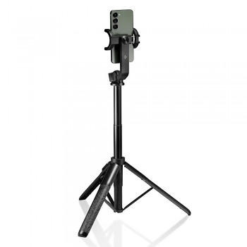 Klíčovou vlastností je její multifunkčnost 2 v 1 – slouží nejen jako klasická selfie tyč, ale také jako stabilní stativ. Rozkládací nohy stativu jsou navrženy pro vysokou stabilitu a jsou opatřeny texturovanými konci pro lepší přilnavost k povrchu. Integrovaný Bluetooth ovladač, který je elegantně uložen v rukojeti, umožňuje pořizovat snímky a videa na vzdálenost až 10 metrů, což vám dává naprostou svobodu při tvorbě. Ovladač je napájen lithiovou baterií s maximální pohotovostní dobou až 6 měsíců.