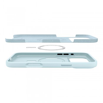 Pouzdro Spigen Silicone Fit MagSafe se vyznačuje hladkým, matným silikonovým povrchem v příjemném tlumeném modrém odstínu, který je nejen esteticky přitažlivý, ale také příjemný na dotek a zajišťuje pevný úchop. Vnitřní strana krytu je opatřena měkkou podšívkou, pravděpodobně z mikrovlákna, která chrání zadní stranu telefonu před poškrábáním. Precizní výřezy pro fotoaparát a porty zajišťují plnou funkčnost, zatímco integrovaná tlačítka poskytují pohodlnou odezvu. Zvýšené okraje kolem displeje a modulu fotoaparátu poskytují dodatečnou ochranu proti poškrábání při položení telefonu na rovný povrch. Kryt je plně kompatibilní s technologií MagSafe, což je indikováno kruhovým magnetickým prvkem viditelným na vnitřní straně pouzdra, zajišťujícím bezproblémové připojení příslušenství MagSafe.