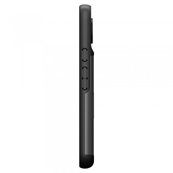 Pouzdro Slim Armor CS se vyznačuje hybridní konstrukcí, která kombinuje odolný polykarbonátový vnější plášť s pružnou vnitřní vrstvou z TPU. Tato kombinace materiálů zajišťuje maximální absorpci nárazů a ochranu proti pádům a poškrábání, aniž by telefonu zbytečně přidávala na objemu. Jeho matný černý povrch dodává telefonu sofistikovaný vzhled a zároveň zlepšuje úchop. Charakteristickým prvkem je integrovaný posuvný slot na karty na zadní straně, který diskrétně a bezpečně pojme až dvě platební karty nebo průkazy. Díky tomu můžete nechat peněženku doma a mít to nejdůležitější vždy po ruce. Přesné výřezy pro fotoaparát a porty, spolu s citlivými krytými tlačítky, zajišťují plnou funkčnost telefonu. Zvýšené okraje kolem displeje a fotoaparátu poskytují dodatečnou ochranu proti poškrábání při položení na rovný povrch.