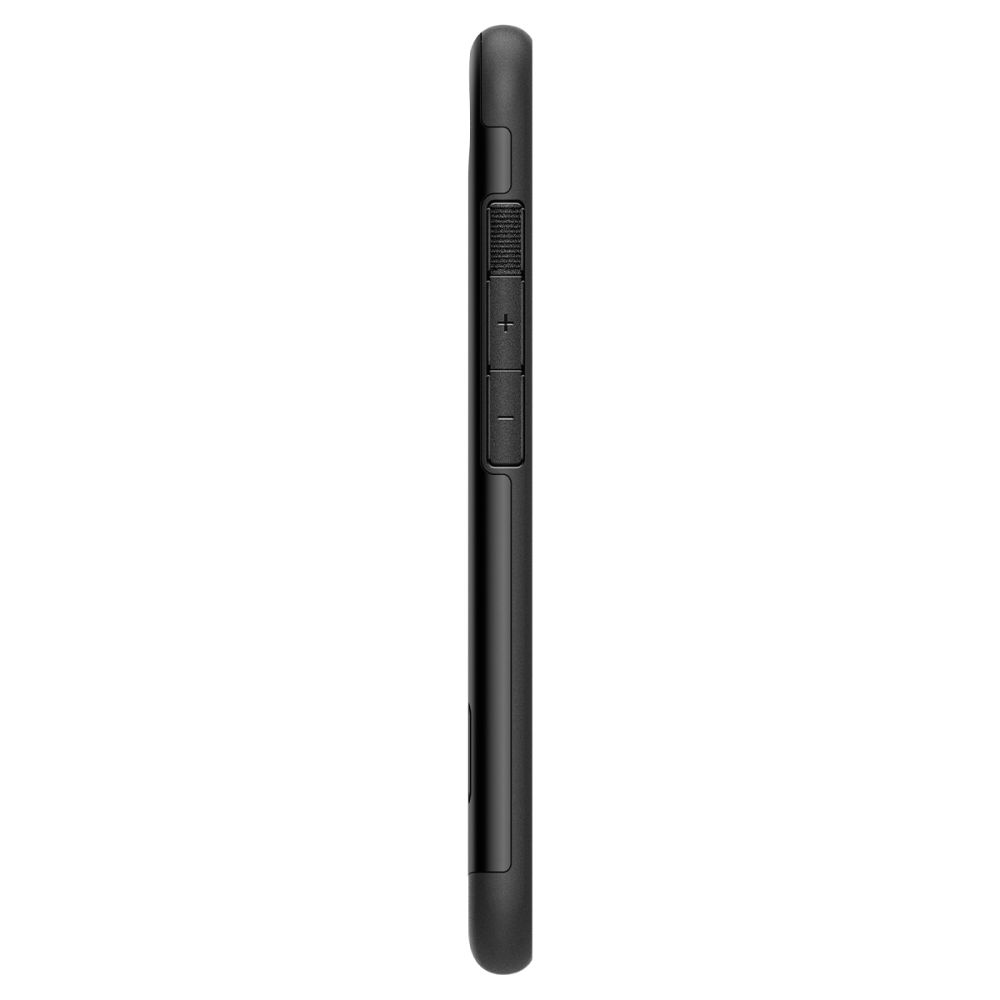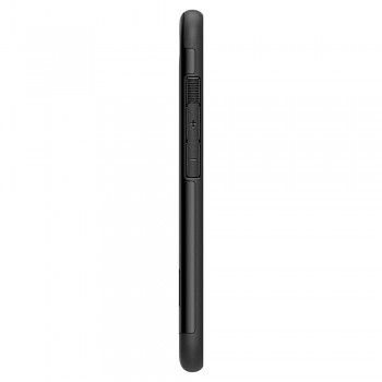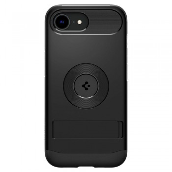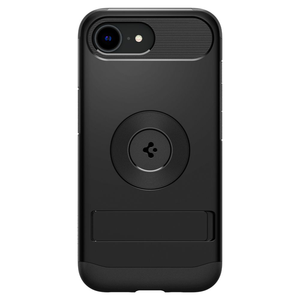 Kryt Spigen Slim Armor MagSafe se pyšní promyšleným designem, který klade důraz na odolnost a praktičnost. Jeho černé matné provedení dodává telefonu sofistikovaný vzhled a zároveň minimalizuje viditelnost otisků prstů. V horní části kolem výřezu pro fotoaparát je patrná jemná žebrovaná textura, která nejen esteticky doplňuje celkový vzhled, ale může také zlepšit úchop. Zbytek zadní strany je hladký, s výrazným integrovaným MagSafe kroužkem, který zajišťuje bezproblémovou kompatibilitu s MagSafe příslušenstvím a rychlé bezdrátové nabíjení.