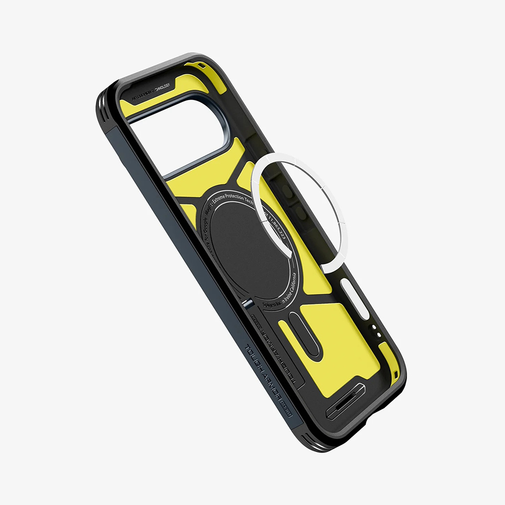 Kryt Spigen Tough Armor MagSafe v odstínu kovová břidlice je navržen tak, aby poskytoval maximální ochranu, aniž by obětoval styl. Jeho robustní konstrukce je patrná na první pohled, s výraznými rohy a zvýšenými okraji, které chrání displej a modul fotoaparátu před přímým kontaktem s povrchem. Vnější vrstva v barvě kovové břidlice dodává krytu prémiový a sofistikovaný vzhled, zatímco vnitřní část je vyvedena v kontrastní žluté barvě, což podtrhuje moderní estetiku a zároveň naznačuje pokročilé technologie ochrany.