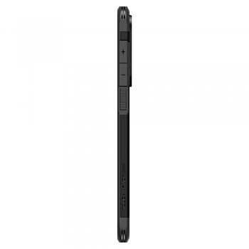 Integrovaná technologie MagSafe zajišťuje bezproblémovou kompatibilitu s MagSafe příslušenstvím, což umožňuje snadné a bezpečné připevnění nabíječek a dalších doplňků. Kryt je navržen s precizními výřezy pro všechny porty a tlačítka, což zaručuje plnou funkčnost telefonu bez nutnosti pouzdro sundávat. Na zadní straně se nachází integrovaný stojánek, který umožňuje pohodlné sledování obsahu v horizontální poloze. Matný černý povrch dodává pouzdru elegantní a profesionální vzhled, zatímco logo Spigen decentně podtrhuje jeho původ.