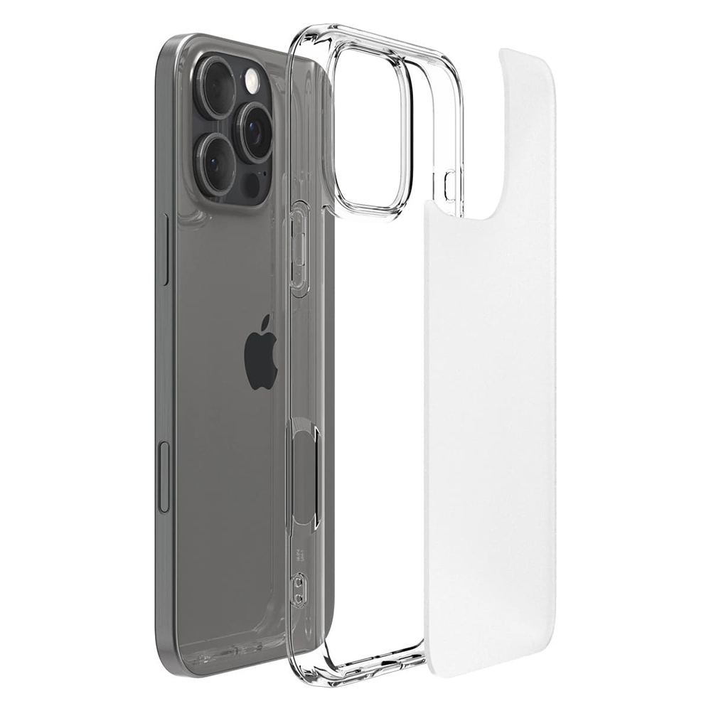 Kryt Spigen Ultra Hybrid se vyznačuje hybridní konstrukcí, která spojuje pevný polykarbonátový zadní panel s pružným TPU rámem. Zadní strana je v elegantní mrazivě čiré (frost clear) úpravě, která decentně matuje povrch, ale stále umožňuje prosvítat logu Apple a originální barvě telefonu. Boky krytu jsou zcela průhledné, což podtrhuje čisté linie iPhonu 16 Pro. Díky precizním výřezům a citlivým tlačítkům je zajištěn snadný přístup ke všem funkcím a portům. Zvýšené okraje kolem displeje a fotoaparátu poskytují dodatečnou ochranu proti poškrábání při položení na rovný povrch. Kryt je navržen tak, aby byl tenký a lehký, a nepřidával telefonu zbytečný objem.