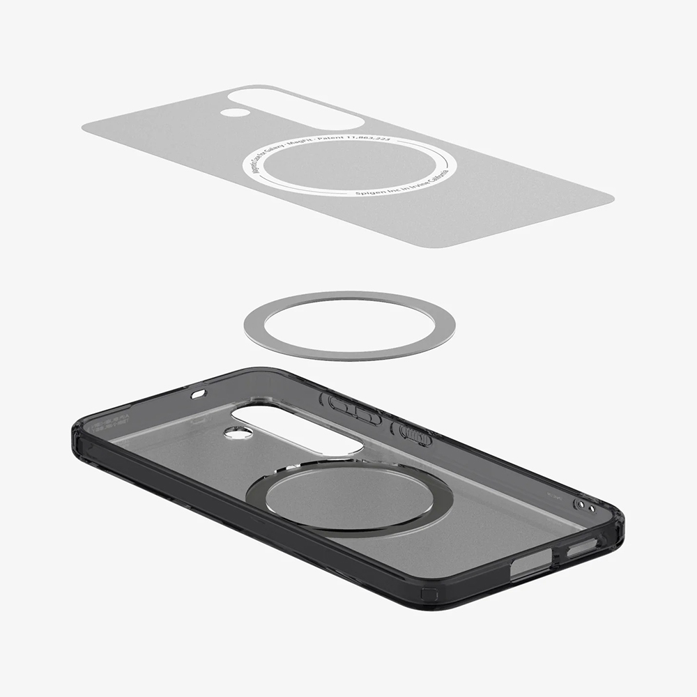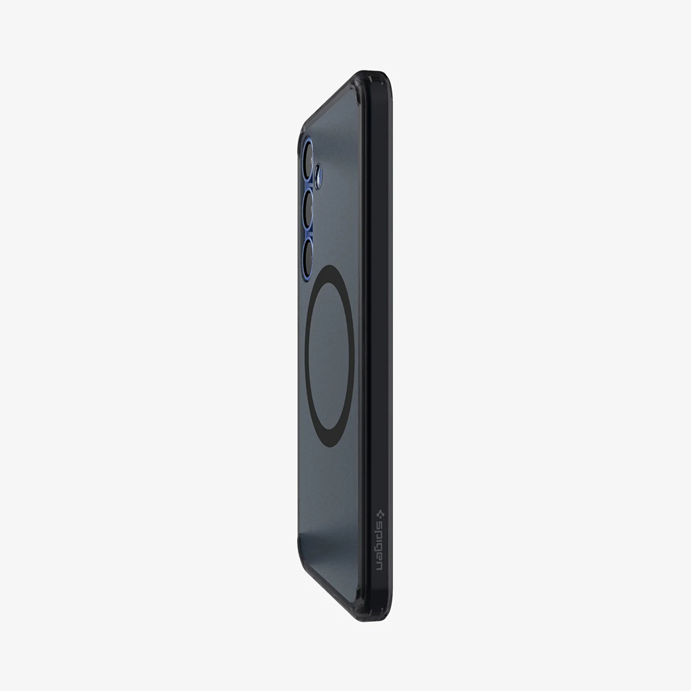 Kryt Spigen Ultra Hybrid MagSafe v provedení Frost Black se vyznačuje minimalistickým a zároveň vysoce funkčním designem. Jeho zadní strana je vyrobena z odolného polykarbonátu s jemným mrazivým, poloprůhledným efektem, který umožňuje prosvítat originální barvě telefonu a logu Samsung, zatímco dodává krytu sofistikovaný vzhled. Integrovaný černý MagSafe kroužek je elegantně zapuštěn do zadní části a zajišťuje bezproblémovou kompatibilitu s MagSafe příslušenstvím. Rámeček krytu je z pružného TPU v tmavé barvě, který absorbuje nárazy a poskytuje pevný úchop. Přesné výřezy pro fotoaparát, porty a tlačítka jsou samozřejmostí, stejně jako zvýšené okraje pro dodatečnou ochranu displeje a objektivů fotoaparátu. Celkový dojem je čistý, moderní a praktický, s důrazem na zachování původního vzhledu telefonu.