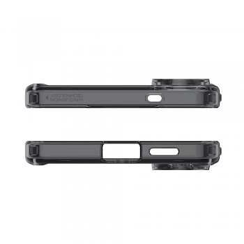 Kryt Spigen Ultra Hybrid MagSafe v provedení Frost Black (mrazivě černá) se vyznačuje elegantním, poloprůhledným zadním panelem, který decentně odhaluje design telefonu a zároveň mu dodává sofistikovaný vzhled. Pevný polykarbonátový zadní panel je doplněn pružným TPU rámečkem, který absorbuje nárazy a zajišťuje snadnou instalaci. Integrovaný magnetický kroužek MagSafe na zadní straně zaručuje perfektní kompatibilitu s MagSafe příslušenstvím, od bezdrátových nabíječek po peněženky, a to s maximální stabilitou a efektivitou. Precizní výřezy pro fotoaparáty a porty zajišťují plnou funkčnost a ochranu každého detailu. Zesílené okraje poskytují zvýšenou ochranu proti pádům, aniž by zbytečně přidávaly na objemu telefonu.