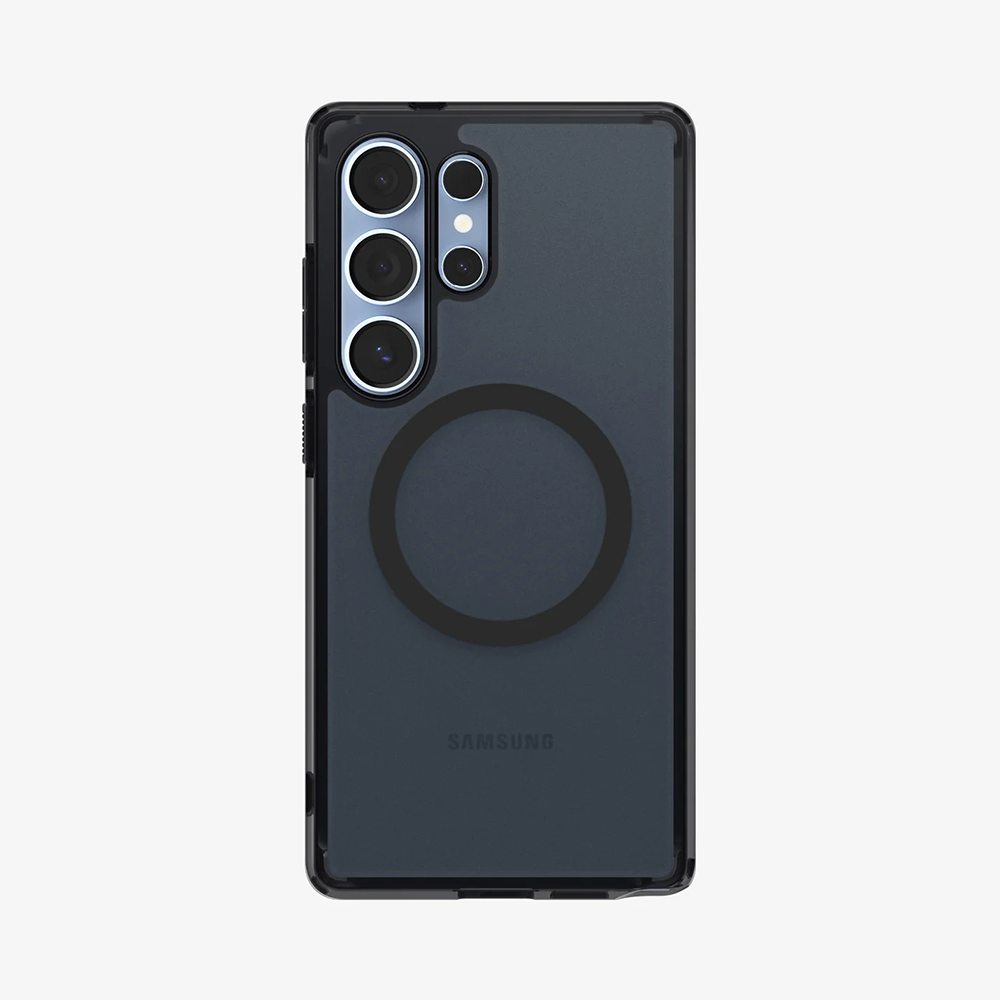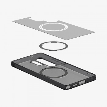 Pouzdro Spigen Ultra Hybrid MagSafe se vyznačuje průsvitným, matným povrchem v odstínu Frost Black, který dodává telefonu sofistikovaný vzhled a zároveň umožňuje vyniknout jeho původnímu designu. Integrovaný magnetický kroužek MagSafe na zadní straně zajišťuje perfektní kompatibilitu s MagSafe příslušenstvím, jako jsou bezdrátové nabíječky nebo peněženky, a to s maximální stabilitou a efektivitou. Kryt je vyroben z kombinace odolného polykarbonátu a flexibilního TPU, což zaručuje vysokou absorpci nárazů a ochranu proti poškrábání. Přesné výřezy pro fotoaparáty, porty a tlačítka zajišťují bezproblémový přístup ke všem funkcím telefonu, aniž by bylo nutné pouzdro sundávat. Zvýšené okraje kolem displeje a fotoaparátu poskytují dodatečnou ochranu proti přímému kontaktu s rovnými povrchy.