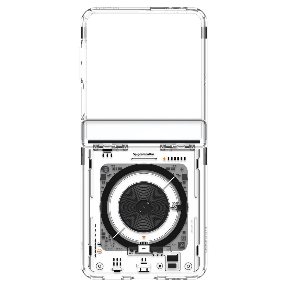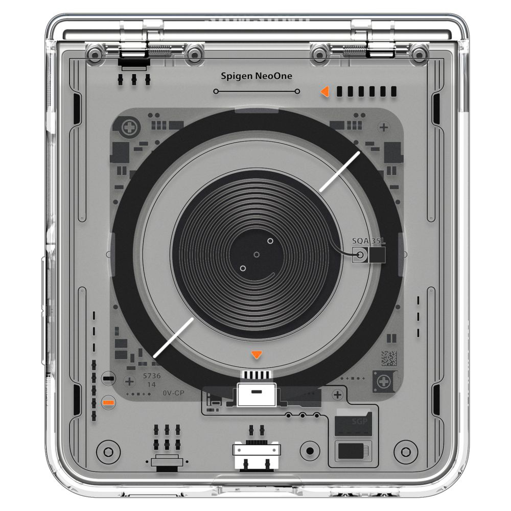 Kryt Spigen Ultra Hybrid Pro MagSafe se pyšní křišťálově čistým transparentním provedením, které nechá vyniknout elegantní linie a barvu vašeho Samsung Galaxy Z Flip7. Co však tento model odlišuje, je jeho unikátní designová řada Neo One. Na zadní straně pouzdra se pod průhlednou vrstvou skrývá fascinující grafika, která imituje vnitřní obvody a technologické komponenty, dodávající telefonu futuristický a sofistikovaný vzhled. Integrovaný MagSafe kompatibilní kroužek zajišťuje pevné a bezpečné uchycení MagSafe příslušenství, jako jsou bezdrátové nabíječky nebo peněženky, a zároveň je elegantně začleněn do celkového designu.