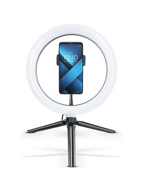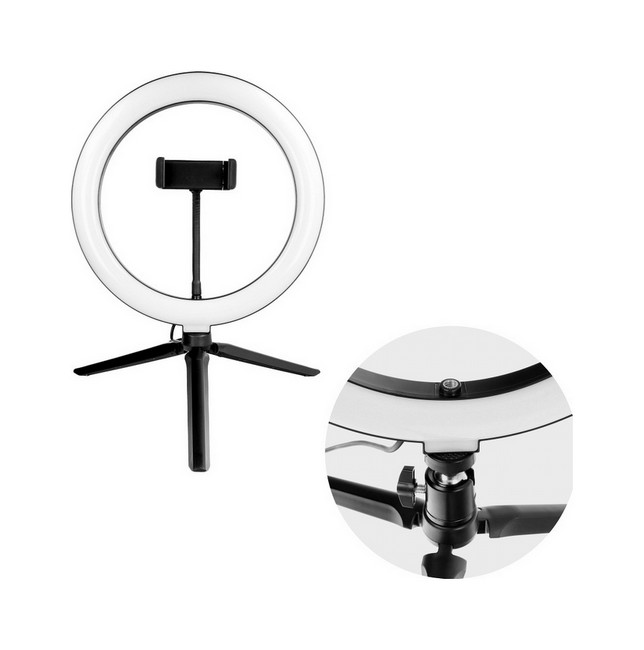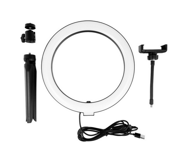 Balení obsahuje Ring Light se zabudovaným USB-A konektorem, tripod stativ a přídavný držák pro fotoaparát a mobilní telefon.