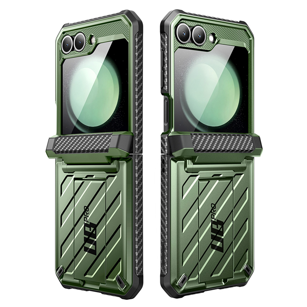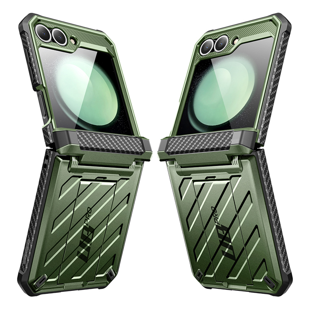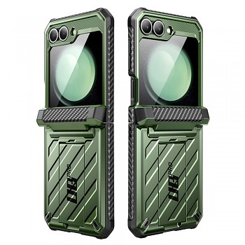 Pouzdro Supcase Unicorn Beetle Pro pro Samsung Galaxy Z Flip7 FE v barevném provedení Guldan se vyznačuje extrémně odolným a robustním designem, který okamžitě evokuje vojenskou ochranu. Jeho vzhled je definován kombinací matných a texturovaných povrchů v tmavě zeleném odstínu, doplněných o detaily s imitací karbonových vláken na pantech a bocích, což dodává pouzdru moderní a dynamický vzhled. Integrovaná ochrana pantu zajišťuje komplexní bezpečí pro nejcitlivější část vašeho skládacího telefonu. Zvýšené okraje kolem fotoaparátu a vnějšího displeje poskytují dodatečnou ochranu proti poškrábání při položení na rovný povrch. Na zadní straně je praktický integrovaný stojánek, který umožňuje pohodlné sledování obsahu v režimu na šířku. Součástí balení je také odnímatelná spona na opasek pro snadné a bezpečné nošení. Díky precizním výřezům jsou všechny porty a tlačítka snadno přístupné.