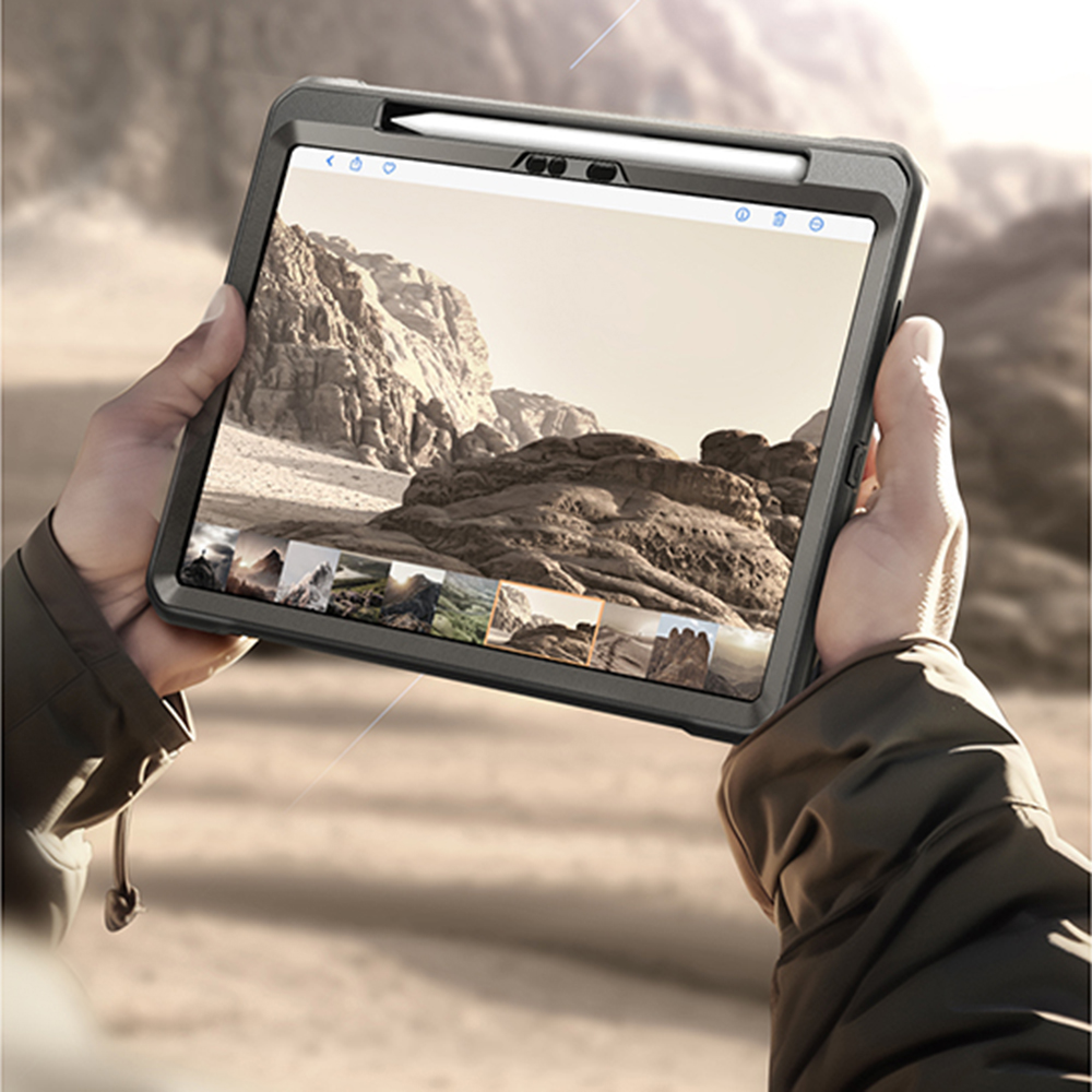 Design pouzdra Unicorn Beetle Pro je ztělesněním odolnosti a moderní estetiky. Pouzdro se vyznačuje vícevrstvou konstrukcí, která kombinuje pružný TPU materiál absorbující nárazy s pevným polykarbonátovým pláštěm. Zesílené rohy a zvýšené okraje poskytují maximální ochranu displeje a fotoaparátu před poškrábáním a prasklinami. Integrovaný stojánek na zadní straně umožňuje pohodlné sledování obsahu v režimu na šířku i na výšku, ideální pro práci i zábavu. Precizní výřezy zajišťují snadný přístup ke všem portům a tlačítkům, zatímco integrované krytky portů chrání před prachem a vlhkostí. Pouzdro je navrženo s ohledem na praktičnost, včetně speciálního slotu pro Apple Pencil, který zajišťuje jeho bezpečné uložení a nabíjení. Celkový vzhled v bílé barvě dodává vašemu iPadu Pro čistý a profesionální vzhled, zatímco robustní textura po stranách zajišťuje bezpečný a pevný úchop.