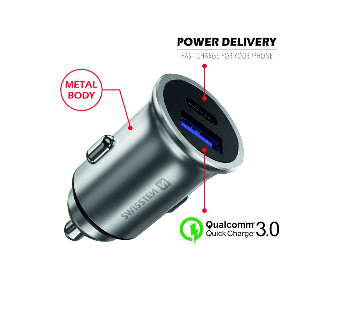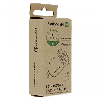 Swissten cl adaptér power delivery usb-c + quick charge 3.0 36w metal silver (eco balení)Elegantní metalická autonabíječka s celkovým výkonem 36W. Výstup USB-C je vybaven technologií POWER DELIVERY pro rychlé nabíjení smartphonů iPhone 8 a novějších. Výstup USB je vybaven technologií Qualcomm 3.0 pro rychlé nabíjení smartphonů s OS Android. Baleno v blistru SWISSTEN.