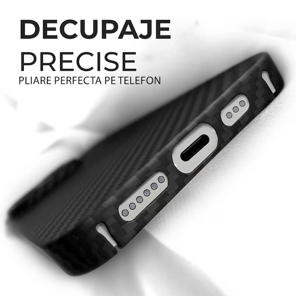 Pouzdro Techsuit Aramid Fiber MagSafe se pyšní elegantním a moderním designem v černé barvě, který podtrhuje sofistikovaný vzhled vašeho telefonu. Jeho povrch zdobí charakteristická textura aramidových vláken, která nejenže dodává pouzdru exkluzivní vzhled, ale také zajišťuje příjemný a jistý úchop. Díky své extrémně tenké konstrukci, pouhých přibližně 0,5 mm, a nízké hmotnosti kolem 11 g, pouzdro téměř nezvětšuje objem ani váhu telefonu, čímž zachovává jeho původní štíhlost.