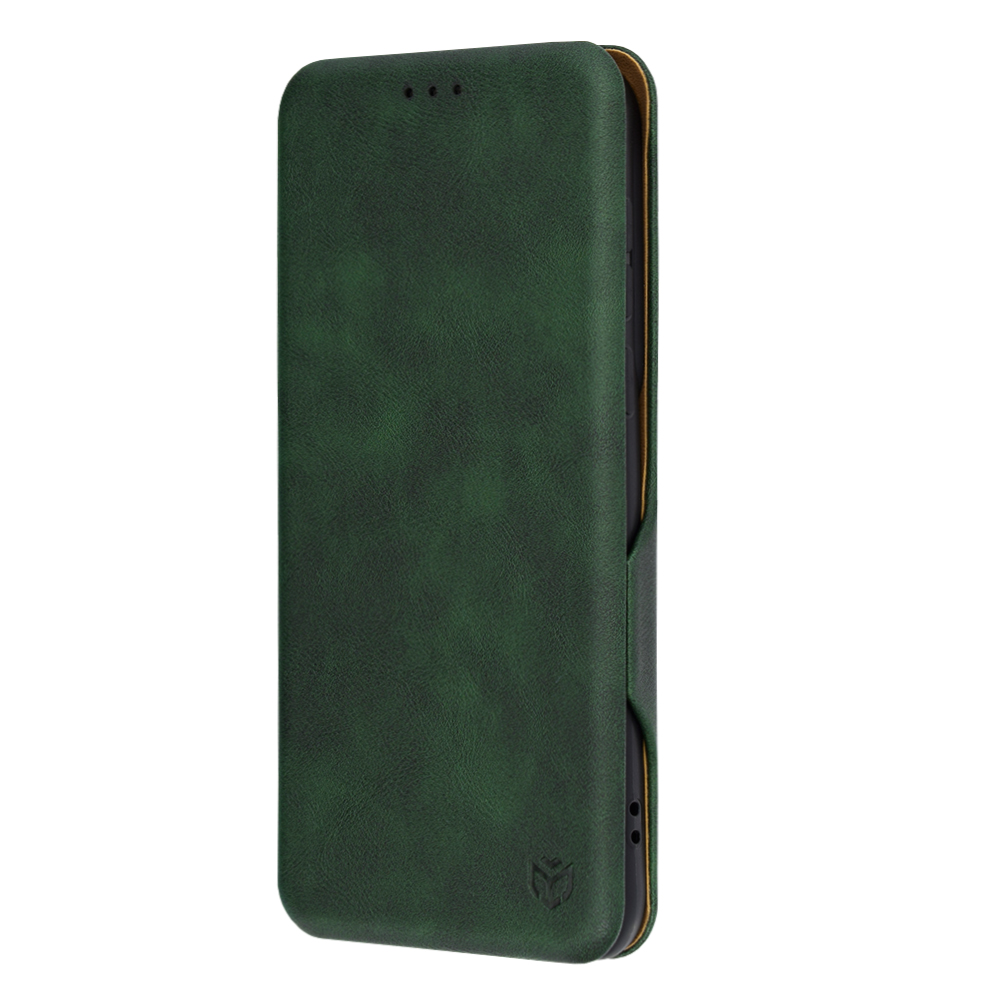 Pouzdro Techsuit Safe Wallet Plus se pyšní sofistikovaným vzhledem v sytě zelené barvě s jemnou texturou, která připomíná broušenou kůži a dodává mu luxusní nádech. Vnitřní strana pouzdra je vyvedena v kontrastní hnědé barvě, což vytváří příjemný vizuální dojem a zároveň chrání displej vašeho telefonu před poškrábáním.
