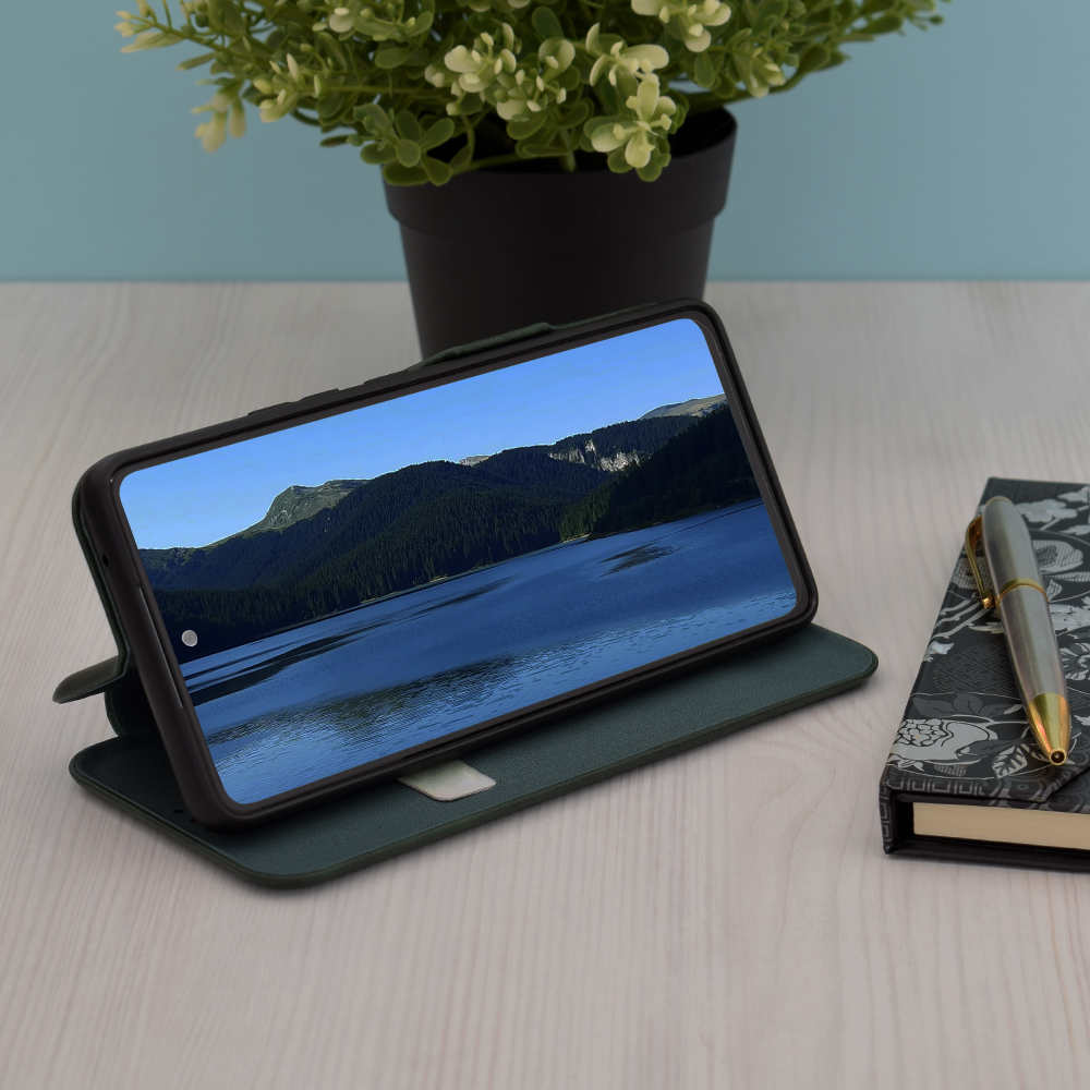 Toto flipové pouzdro se vyznačuje nadčasovým designem a precizním zpracováním. Vnější strana je vyrobena z materiálu s jemnou texturou, která připomíná kůži, a dodává pouzdru luxusní vzhled a příjemný pocit na dotek. Sytě zelený odstín je elegantní a zároveň moderní. Pouzdro je navrženo tak, aby dokonale obepínalo telefon, s přesnými výřezy pro fotoaparát, reproduktory, mikrofon a nabíjecí port. Přední odklápěcí část chrání displej před poškrábáním a nárazy, a obsahuje diskrétní otvory pro sluchátko, což umožňuje telefonování i se zavřeným pouzdrem. Na přední straně je decentně umístěno logo značky Techsuit, které podtrhuje jeho originalitu.