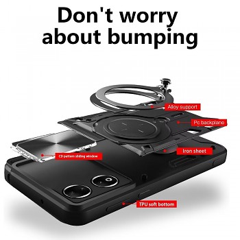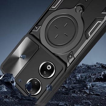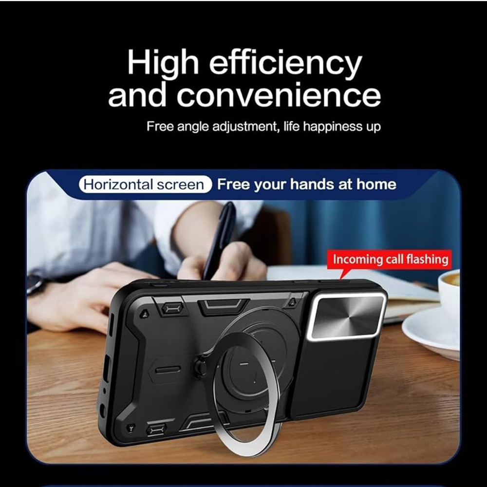 Pouzdro Techsuit CamGuard Pro v elegantní černé barvě je navrženo s ohledem na maximální ochranu a praktičnost. Jeho robustní konstrukce z odolného materiálu poskytuje spolehlivou ochranu proti nárazům a pádům. Dominantním prvkem je integrovaný posuvný kryt fotoaparátu s jemnou texturou, který chrání čočky před poškrábáním a nečistotami, když je nepoužíváte. Zadní strana pouzdra je dále vybavena otočným kroužkem, který slouží jako praktický stojánek pro sledování obsahu nebo jako bezpečný úchyt pro pohodlné držení telefonu. Celkový design je doplněn o taktické prvky a textury, které zlepšují úchop a dodávají pouzdru moderní a dynamický vzhled.
