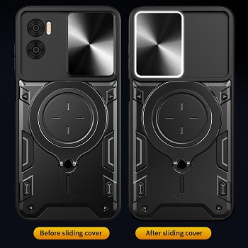 S krytem CamGuard Pro získáte nejen spolehlivou ochranu, ale také stylový doplněk. Design krytu kombinuje robustní černou konstrukci s výraznými červenými prvky, které dodávají pouzdru dynamický a moderní vzhled. Zadní strana je opatřena posuvným krytem fotoaparátu s elegantním broušeným kovovým efektem v červené barvě, který efektivně chrání objektivy před poškrábáním a nečistotami. Integrovaný kovový kroužek slouží jako praktický stojánek pro pohodlné sledování obsahu nebo jako bezpečný úchyt pro pevnější držení telefonu. Celkový vzhled je doplněn o detaily připomínající pancéřování, což podtrhuje jeho vysokou odolnost a připravenost čelit každodenním výzvám.