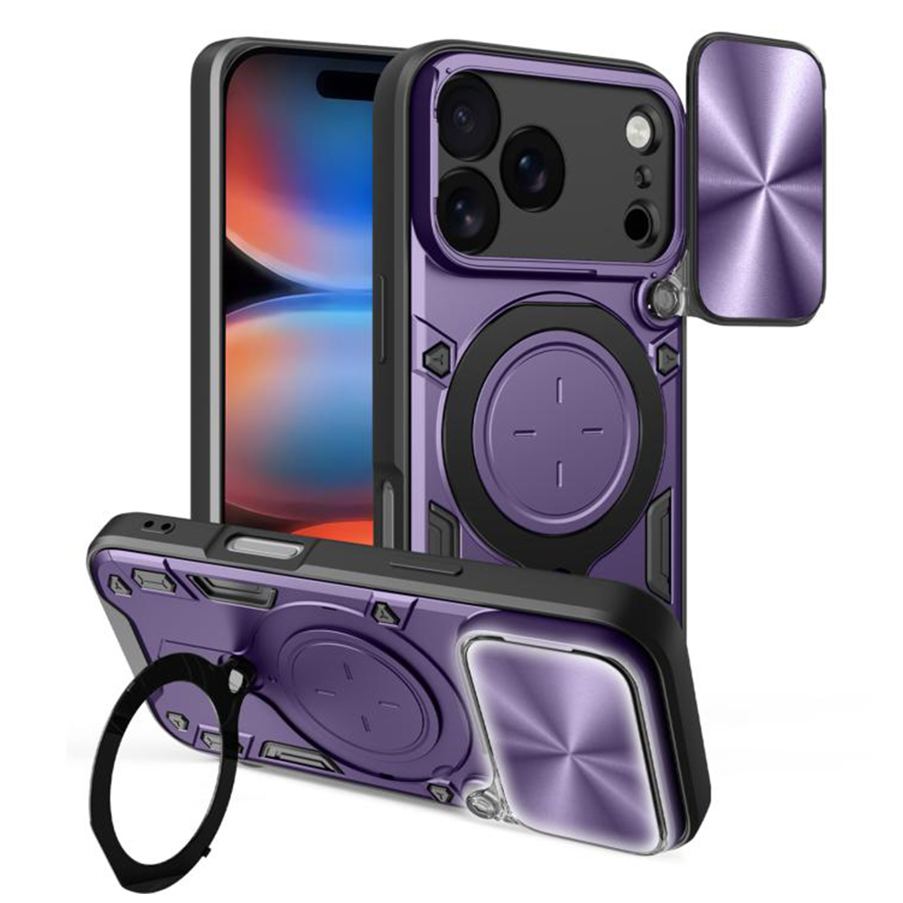 Pouzdro Techsuit CamGuard Pro se pyšní robustním a moderním designem, který dokonale doplňuje linie vašeho iPhone 17 Pro Max. Jeho dvouvrstvá konstrukce kombinuje pevný vnější plášť s pružnými prvky pro maximální absorpci nárazů. Dominantou zadní strany je integrovaný posuvný kryt fotoaparátu s elegantní broušenou texturou ve fialovém odstínu, který spolehlivě chrání citlivé čočky před poškrábáním a nečistotami. Dalším praktickým prvkem je otočný kroužek, který slouží jako stabilní stojánek pro pohodlné sledování obsahu nebo jako bezpečné držadlo pro pevnější úchop telefonu. Přesné výřezy zajišťují bezproblémový přístup ke všem portům a tlačítkům, které si zachovávají jistý a příjemný stisk.