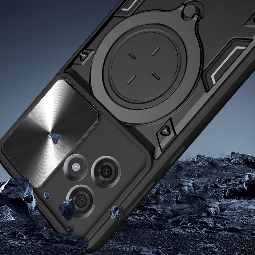 Kryt Techsuit CamGuard Pro se pyšní moderním a odolným designem s výraznými, lehce futuristickými prvky. Jeho fialové provedení dodává telefonu osobitý styl. Na zadní straně dominuje posuvný kryt fotoaparátu z kartáčovaného materiálu, který efektivně chrání citlivé objektivy před poškrábáním a nárazy. Tento kryt je navržen tak, aby se dal snadno odsunout pro rychlé pořízení fotografií a opět zasunout pro maximální ochranu. Integrovaný kruhový prvek na zadní straně slouží jako praktický stojánek pro pohodlné sledování obsahu nebo jako úchyt pro bezpečnější držení telefonu. Celková konstrukce pouzdra je vícevrstvá, což zaručuje zvýšenou odolnost proti pádům a otřesům.