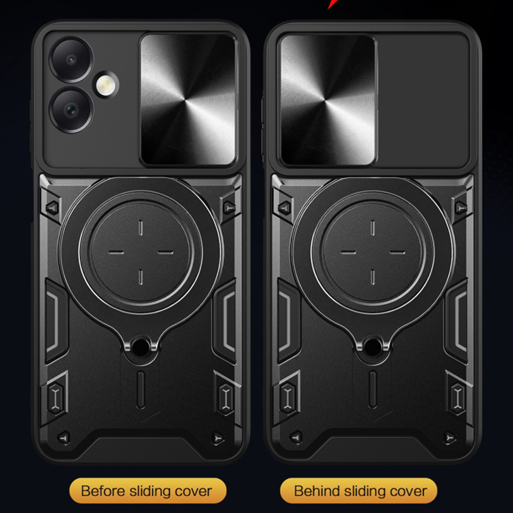 Kryt Techsuit CamGuard Pro se pyšní taktickým a odolným vzhledem, který okamžitě upoutá pozornost. Jeho zadní strana je opatřena výraznými texturami a zvýšenými okraji, které nejenže dodávají krytu dynamický charakter, ale také zlepšují úchop a minimalizují riziko vyklouznutí telefonu z ruky. Dominantním prvkem je integrovaný posuvný kryt fotoaparátu s elegantní texturou broušeného kovu, který spolehlivě chrání čočky před poškrábáním a nečistotami. Uprostřed zadní strany naleznete praktický otočný kroužek, který slouží jako stojánek pro pohodlné sledování obsahu nebo jako bezpečný úchyt pro prst. Tento kroužek je navíc kompatibilní s magnetickými držáky do auta, což zvyšuje jeho praktičnost. Zesílené rohy krytu poskytují extra ochranu proti pádům a nárazům, zatímco precizní výřezy zajišťují bezproblémový přístup ke všem portům a tlačítkům.