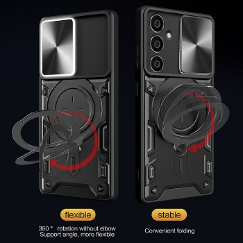 Pouzdro Techsuit CamGuard Pro se pyšní moderním a funkčním designem, který kombinuje estetiku s maximální ochranou. Jeho robustní konstrukce s vyvýšenými okraji efektivně chrání displej a fotoaparát před poškrábáním a nárazy. Dominantním prvkem je posuvný kryt fotoaparátu s texturou broušeného kovu, který zajišťuje diskrétní a spolehlivou ochranu citlivých čoček. Integrovaný kovový prstenec na zadní straně slouží nejen pro bezpečnější úchop telefonu, ale také jako praktický stojánek pro pohodlné sledování obsahu. Díky přesnému zpracování jsou všechny výřezy pro konektory, mikrofony, reproduktory i fotoaparáty dokonale sladěny, což zaručuje neomezenou funkčnost vašeho zařízení. Tlačítka mají jistý stisk a přístup k nabíjecímu portu je vždy bezproblémový.