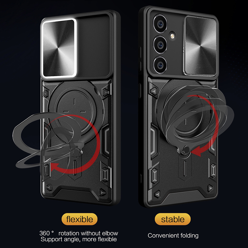 Kryt Techsuit CamGuard Pro se pyšní robustním a zároveň sofistikovaným designem. Je vyroben z kombinace měkkého TPU materiálu na spodní části a pevného PC panelu na zádech, což zajišťuje optimální absorpci nárazů a odolnost proti poškrábání. Dominantním prvkem je integrovaný kruhový držák, který slouží nejen jako bezpečný úchyt pro telefon, ale také jako praktický stojánek. Díky možnosti rotace o 360 stupňů můžete telefon pohodlně umístit horizontálně i vertikálně, což je ideální pro sledování videí nebo videohovory.