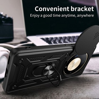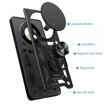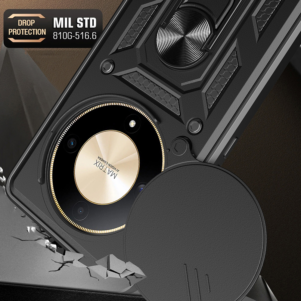 Tento černý kryt se pyšní robustním a moderním designem, který nejen skvěle vypadá, ale především chrání. Jeho konstrukce kombinuje odolný TPU materiál s pevnými prvky, které zajišťují vysokou odolnost proti pádům a nárazům, splňující standard MIL STD 810G-516.6. Klíčovou vlastností je integrovaný posuvný kryt fotoaparátu, takzvaný CamShield, který efektivně chrání objektivy před poškrábáním a nečistotami, když je nepoužíváte.