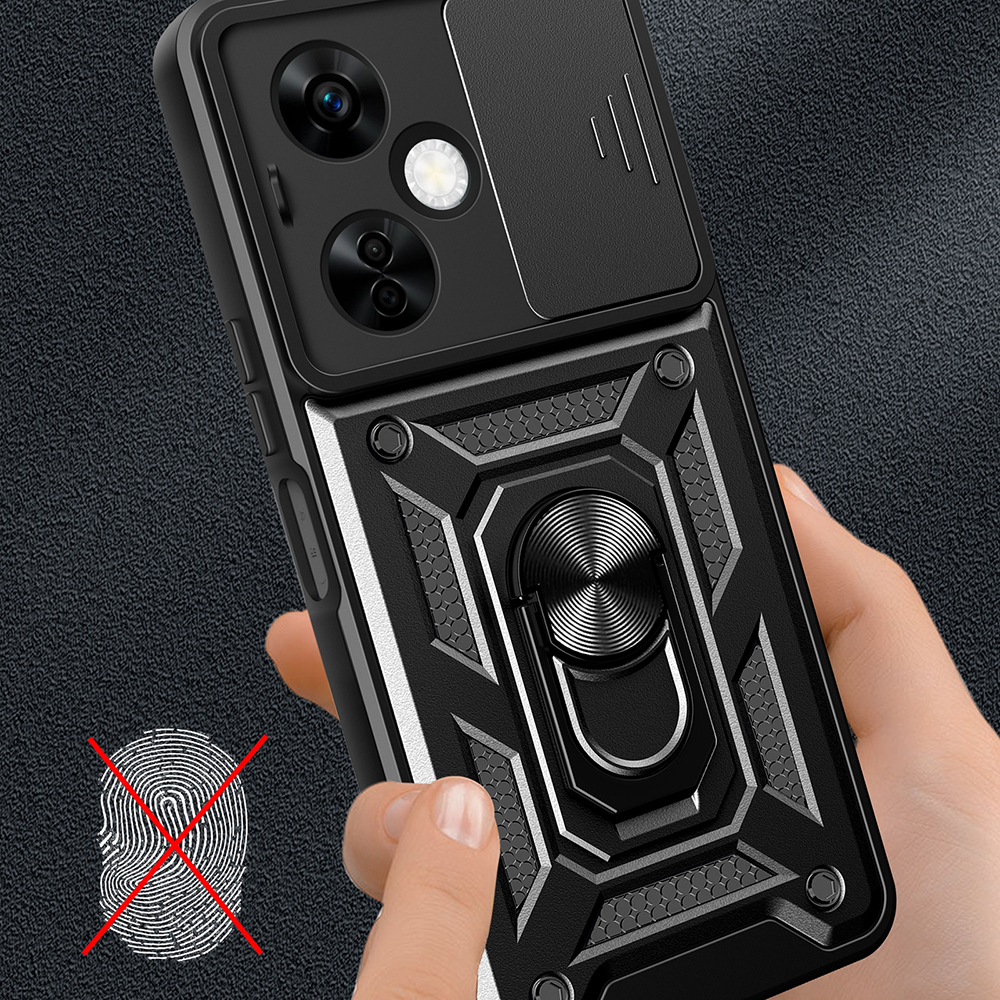 Toto pouzdro v atraktivní zelené barvě s černými akcenty je navrženo tak, aby poskytovalo maximální ochranu a zároveň podtrhlo moderní vzhled vašeho telefonu. Robustní konstrukce kombinuje pevné materiály, které efektivně absorbují nárazy a chrání před poškrábáním. Dominantou zadní strany je integrovaný posuvný kryt fotoaparátu CamShield, který spolehlivě chrání čočky před poškozením a nechtěným znečištěním. Součástí designu je také otočný kovový kroužek, který slouží jako praktický stojánek pro sledování obsahu nebo jako bezpečný úchyt pro pohodlnější manipulaci s telefonem. Celkový vzhled doplňuje geometrický vzor na zadní straně, který dodává pouzdru moderní a dynamický charakter.