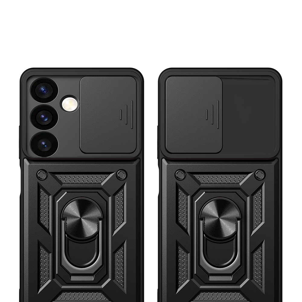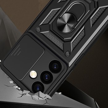 Pouzdro Techsuit CamShield se vyznačuje odolnou konstrukcí, která efektivně chrání telefon před nárazy a poškrábáním. Je vyrobeno z kombinace měkkého TPU materiálu pro absorpci otřesů a pevného PC plastu, který zajišťuje celkovou pevnost a ochranu. Dominantním prvkem je integrovaný posuvný kryt fotoaparátu (CamShield), který spolehlivě chrání čočky před poškozením a nečistotami, když je nepoužíváte.