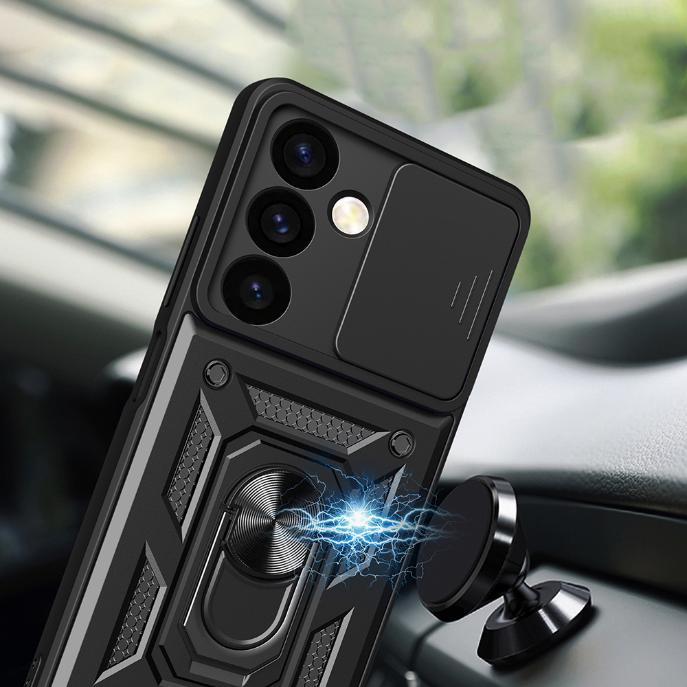 Na zadní straně pouzdra naleznete multifunkční kovový kroužek s elegantním CD vzorem. Tento kroužek slouží nejen jako praktický stojánek pro pohodlné sledování obsahu, ale také jako bezpečný úchyt pro lepší manipulaci s telefonem. Díky integrované magnetické vrstvě je pouzdro kompatibilní s magnetickými držáky do auta, což zvyšuje jeho univerzálnost. Celkový vzhled doplňuje moderní, lehce taktický vzor na zadní straně, který nejen skvěle vypadá, ale také zlepšuje úchop.
