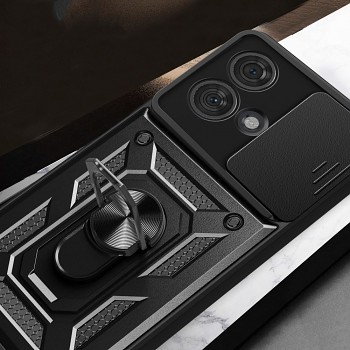 Pouzdro se pyšní moderním a odolným designem, který kombinuje estetiku s maximální funkčností. Jeho černé provedení s texturovanými detaily a geometrickými vzory dodává telefonu sofistikovaný vzhled a zároveň zlepšuje úchop. Klíčovou vlastností je integrovaný posuvný kryt CamShield, který chrání objektivy fotoaparátu před poškrábáním a nechtěným znečištěním, a navíc zajišťuje vaše soukromí.