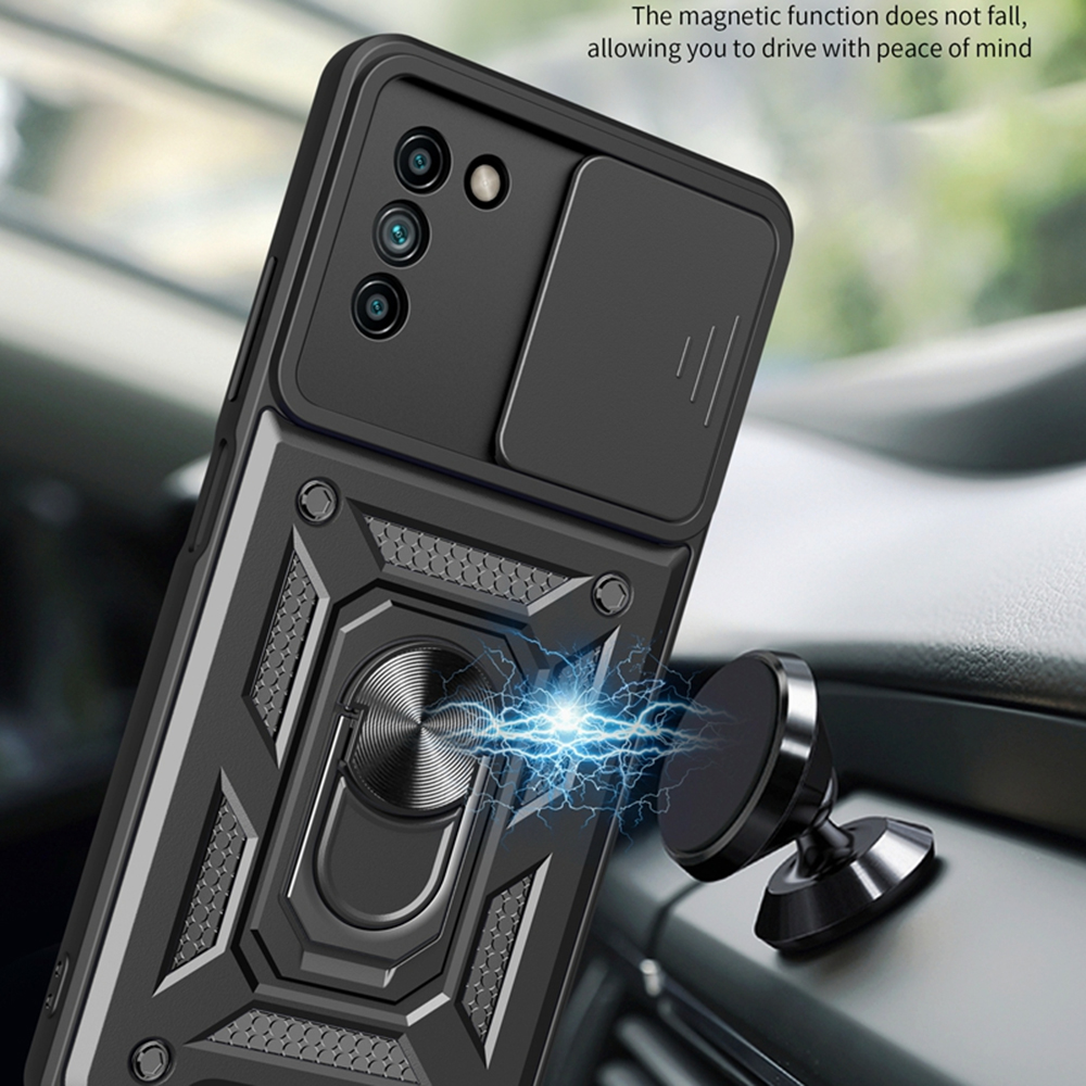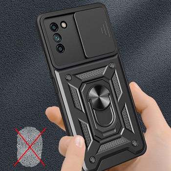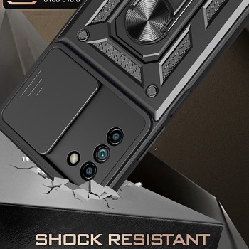 Pouzdro Techsuit CamShield Series se vyznačuje robustním a promyšleným designem. Jeho černá barva dodává telefonu sofistikovaný vzhled, zatímco zesílené rohy a texturovaný povrch zajišťují lepší úchop a zvýšenou odolnost proti nárazům a pádům. Klíčovým prvkem je integrovaný posuvný kryt fotoaparátu (CamShield), který efektivně chrání čočky před poškrábáním a nečistotami, a zároveň zajišťuje vaše soukromí. Na zadní straně pouzdra naleznete také praktický kovový kroužek, který slouží jako bezpečný držák pro lepší úchop telefonu a zároveň jako stojánek pro pohodlné sledování obsahu. Přesné výřezy pro konektory, mikrofony, reproduktory a fotoaparáty zaručují, že funkčnost vašeho telefonu nebude nikdy omezena a tlačítka mají jistý stisk.