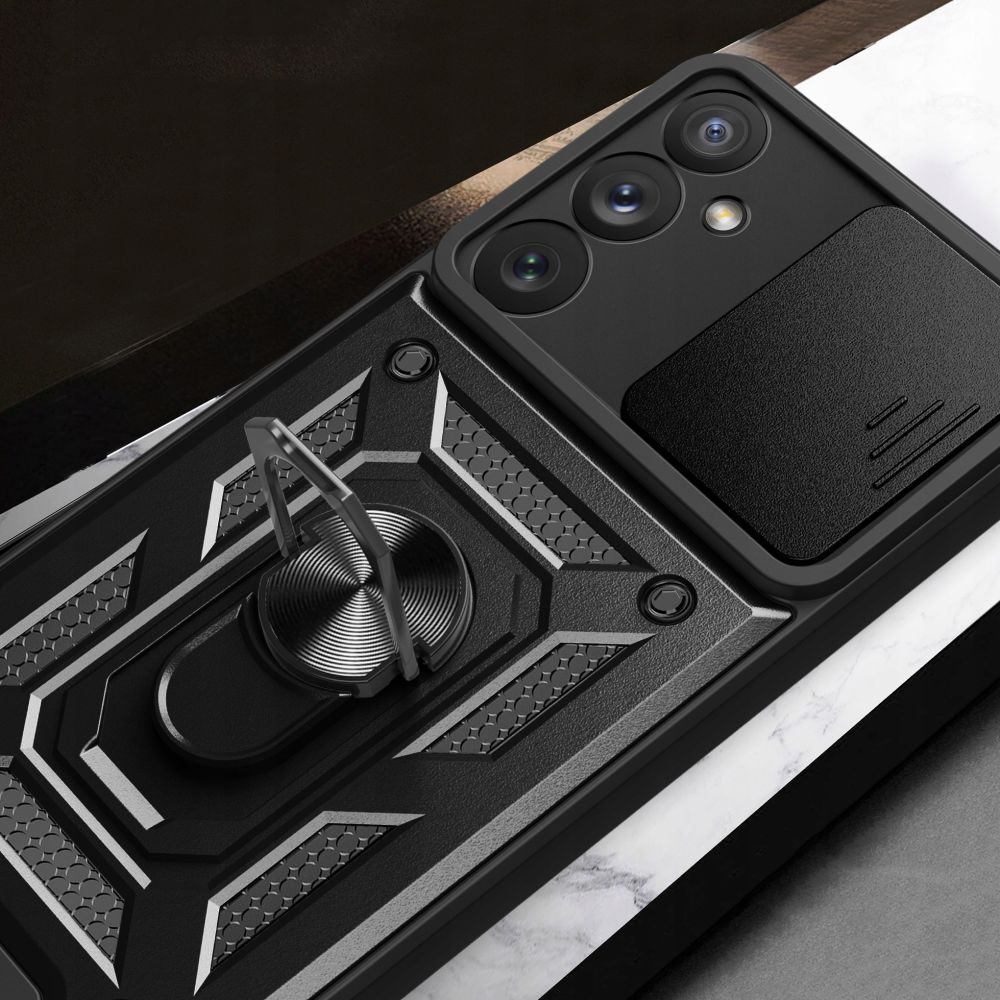 Toto pouzdro se pyšní odolným a promyšleným designem, který efektivně chrání váš telefon před nárazy, poškrábáním a každodenním opotřebením. Jeho černá barva a texturovaný povrch dodávají zařízení sofistikovaný a zároveň sportovní vzhled. Klíčovou inovací je integrovaný posuvný kryt fotoaparátu CamShield, který chrání citlivé objektivy před poškozením a zároveň zajišťuje vaše soukromí. Na zadní straně pouzdra naleznete multifunkční kovový kroužek, který slouží jako praktický stojánek pro pohodlné sledování videí nebo jako bezpečný úchyt pro pevnější držení telefonu. Díky kovovému prvku je pouzdro navíc kompatibilní s magnetickými držáky do auta, což zvyšuje jeho praktičnost. Precizní výřezy zaručují snadný přístup ke všem portům, tlačítkům a funkcím telefonu, aniž by bylo nutné pouzdro sundávat.