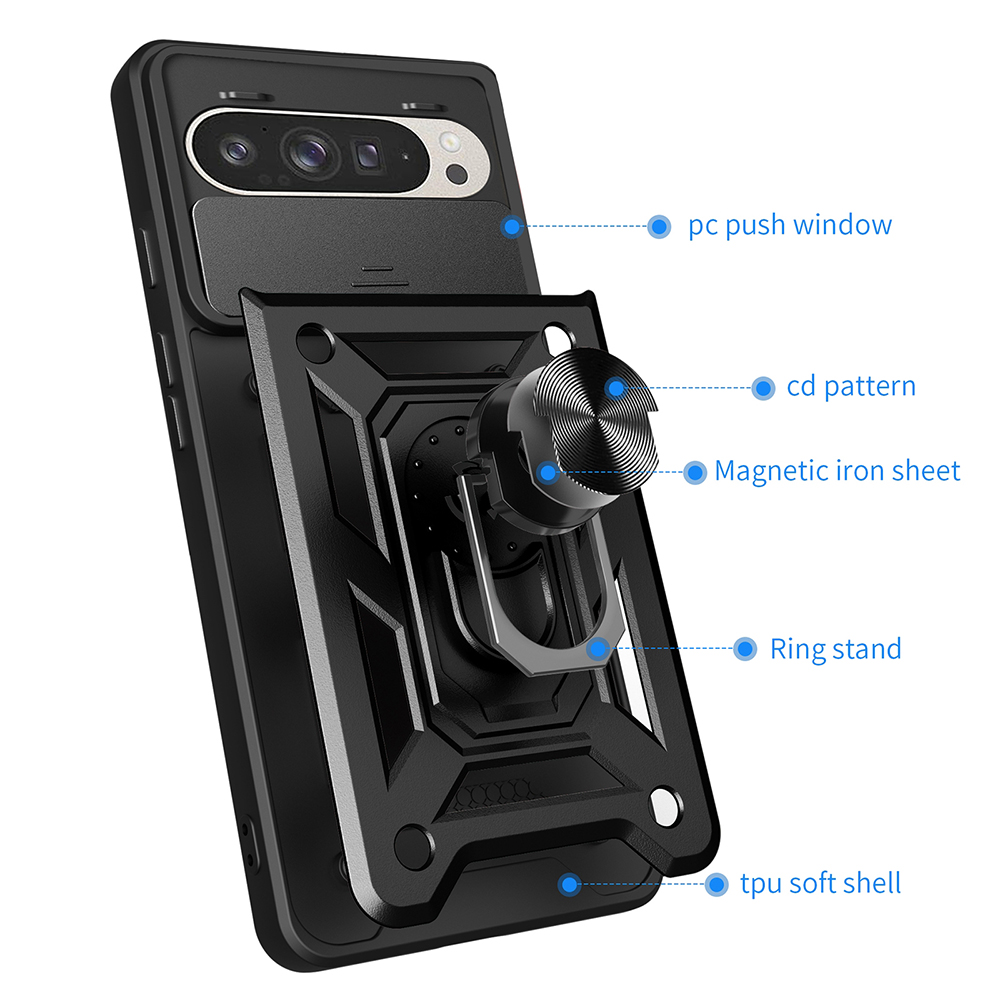 Design pouzdra Techsuit CamShield Series je promyšlen do posledního detailu. Dominantním prvkem je integrovaný posuvný kryt fotoaparátu, který efektivně chrání čočky před poškrábáním a nečistotami, a zároveň zajišťuje vaše soukromí. Pouzdro je vyrobeno z odolného materiálu s robustní texturou, která nejenže dodává zařízení moderní a taktický vzhled, ale také zlepšuje úchop a minimalizuje riziko vyklouznutí z ruky. V zadní části je navíc integrován otočný kroužek, který slouží jako praktický stojánek pro sledování obsahu nebo jako bezpečný úchyt pro prst, čímž zvyšuje komfort a bezpečnost používání telefonu. Zesílené rohy a zvýšené okraje kolem displeje poskytují maximální ochranu proti pádům a nárazům.