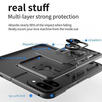 Dalším praktickým prvkem je otočný kovový kroužek, který slouží jako stabilní stojánek pro pohodlné sledování obsahu nebo jako bezpečný držák pro pevnější úchop telefonu. Kryt je vyroben z kombinace odolných materiálů, které absorbují nárazy a chrání telefon před pády a poškrábáním. Zesílené rohy a texturovaný povrch dodávají pouzdru moderní, taktický vzhled a zároveň zlepšují ergonomii držení.