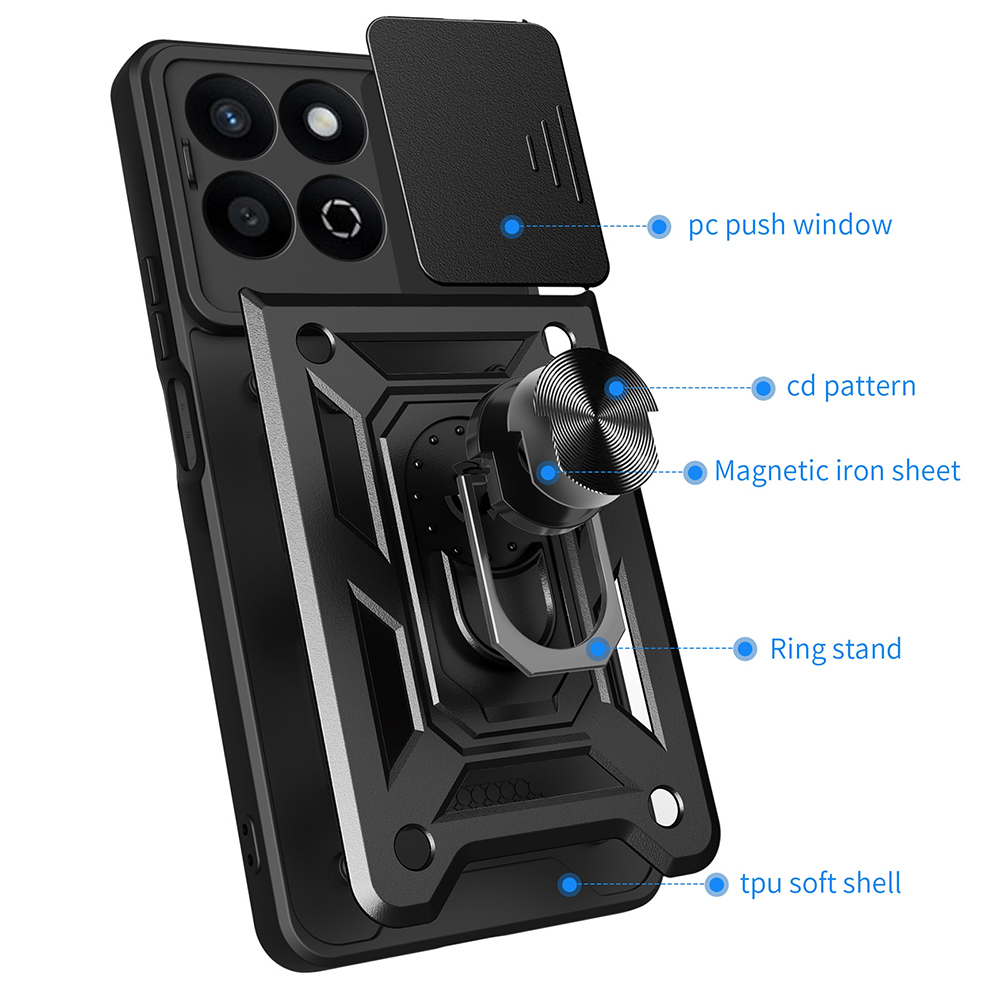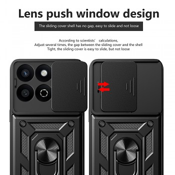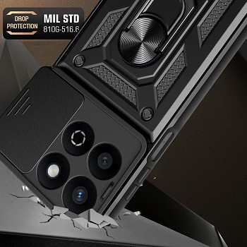 Mezi klíčové funkční prvky patří integrovaný posuvný kryt fotoaparátu, známý jako CamShield. Ten spolehlivě chrání objektivy vašeho telefonu před poškrábáním a nečistotami, a zároveň zajišťuje vaše soukromí. Další praktickou součástí je otočný kovový kroužek na zadní straně, který slouží jako stabilní stojánek pro pohodlné sledování obsahu a zároveň jako bezpečný úchyt pro pevnější držení telefonu. Díky integrované magnetické destičce je pouzdro plně kompatibilní s magnetickými držáky do auta, což z něj činí ideálního společníka na cesty. Pouzdro splňuje standard MIL STD 810G-516.6 pro ochranu proti pádu.