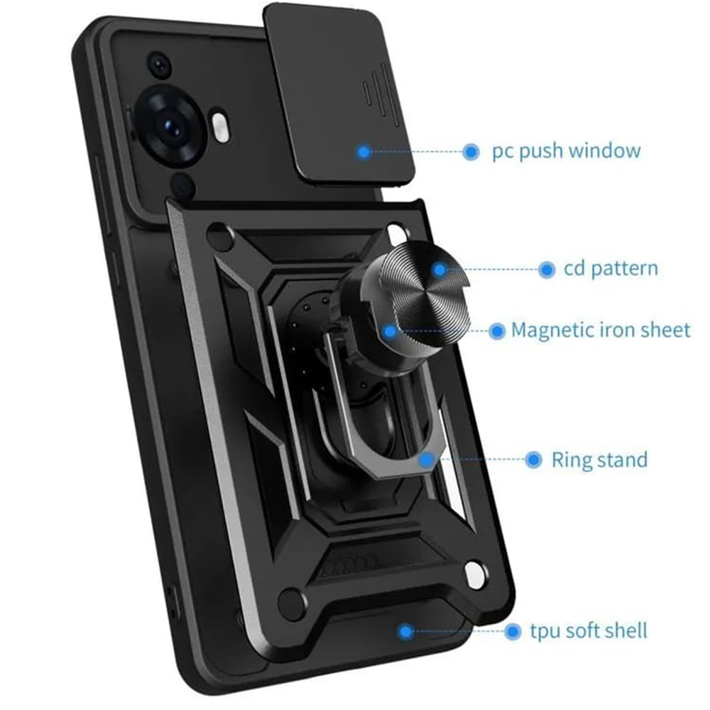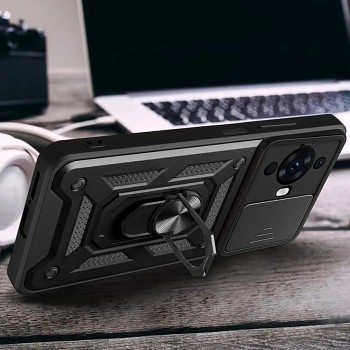 Jedním z klíčových prvků je integrovaný posuvný kryt fotoaparátu (CamShield), který spolehlivě chrání čočky před poškrábáním a zároveň zajišťuje soukromí. Další praktickou funkcí je otočný kovový kroužek na zadní straně, který slouží jako stojánek pro pohodlné sledování obsahu bez použití rukou a zároveň jako bezpečný úchyt pro pevnější držení telefonu. Kroužek je navíc vybaven magnetickou železnou deskou, což umožňuje snadné připevnění telefonu k magnetickým držákům v autě. Zesílené rohy krytu poskytují zvýšenou odolnost proti nárazům a chrání nejzranitelnější části vašeho zařízení.