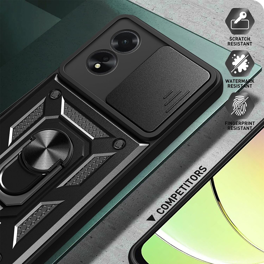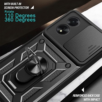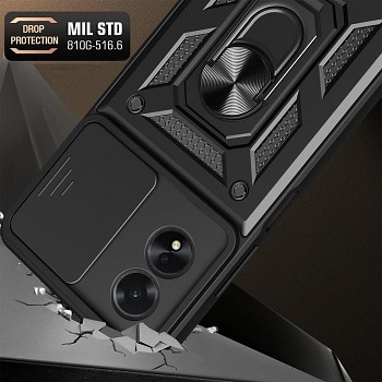 Pouzdro Techsuit CamShield Series v elegantní černé barvě se vyznačuje robustním a funkčním designem. Jeho hlavní předností je integrovaný posuvný kryt fotoaparátu (CamShield), který efektivně chrání objektivy před poškrábáním a nechtěným poškozením, a zároveň zajišťuje vaše soukromí. Zadní strana pouzdra je obohacena o integrovaný kovový kroužek, který slouží jako praktický stojánek pro pohodlné sledování obsahu nebo jako bezpečný úchyt pro stabilnější držení telefonu. Celkový vzhled doplňují texturované prvky a zesílené rohy, které dodávají pouzdru moderní, taktický vzhled a zároveň zvyšují odolnost proti nárazům a pádům.