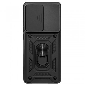 Pouzdro Techsuit CamShield Series v elegantní černé barvě se vyznačuje robustní konstrukcí a propracovaným designem. Na zadní straně pouzdra dominuje posuvný kryt pro ochranu fotoaparátu, který efektivně chrání čočky před poškrábáním a nečistotami, když nejsou používány. Integrovaný kovový kroužek slouží jako praktický stojánek pro pohodlné sledování obsahu nebo jako bezpečný úchyt pro stabilnější držení telefonu. Celkový vzhled doplňují geometrické textury a detaily, které pouzdru dodávají moderní a dynamický vzhled, zároveň zlepšují úchop a minimalizují riziko vyklouznutí z ruky. Přesné výřezy zajišťují bezproblémový přístup ke všem konektorům, mikrofonům, reproduktorům i fotoaparátům, zatímco tlačítka mají jistý a citlivý stisk.