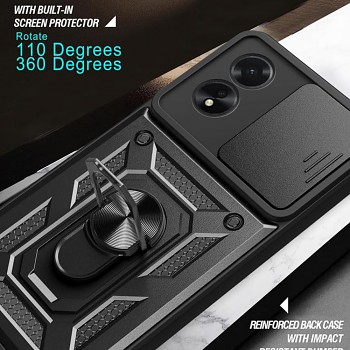 Na zadní straně pouzdra naleznete praktický kovový kroužek, který slouží jako bezpečný úchyt pro pohodlnější držení telefonu a zároveň jako integrovaný stojánek. Ten umožňuje sledování obsahu v horizontální poloze bez nutnosti držet telefon v ruce. Kroužek je navržen tak, aby se otáčel o 360 stupňů a vyklápěl o 110 stupňů, což zajišťuje maximální flexibilitu použití. Pouzdro je navrženo s přesnými výřezy pro všechny konektory, mikrofony, reproduktory a fotoaparáty, což zaručuje plnou funkčnost vašeho zařízení bez omezení. Tlačítka si zachovávají jistý stisk a přístup k nabíjecímu portu je vždy bezproblémový.