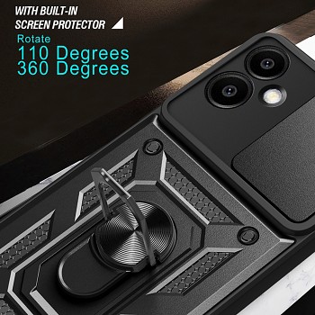 Pouzdro Techsuit CamShield Series se pyšní dvoubarevným provedením, které kombinuje elegantní růžově zlatou s matně černými detaily, dodávajícími krytu moderní a odolný vzhled. Dominantním prvkem je integrovaný posuvný kryt fotoaparátu CamShield v růžově zlaté barvě, který efektivně chrání čočky před poškrábáním a nečistotami, a zároveň zajišťuje vaše soukromí. Spodní část zadní strany je osazena robustním panelem s geometrickými tvary, do kterého je elegantně integrován kovový otočný kroužek. Ten slouží nejen jako praktický stojánek pro sledování obsahu, ale také jako bezpečný úchyt pro pohodlnější manipulaci s telefonem. Kombinace tvrdého polykarbonátu a pružného TPU materiálu zajišťuje vysokou odolnost proti nárazům a pádům, zatímco zvýšené okraje chrání displej a modul fotoaparátu před přímým kontaktem s povrchem.