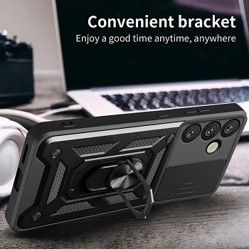 Kryt Techsuit CamShield Series se vyznačuje promyšleným a funkčním designem. Zadní strana je rozdělena na dvě hlavní části. Horní část, v tmavě šedé barvě, elegantně obklopuje modul fotoaparátu a je vybavena posuvným krytem objektivu v modré barvě, který zajišťuje maximální ochranu citlivých čoček před poškrábáním a nečistotami. Spodní část krytu, rovněž v modré barvě, má robustní, taktický vzhled s výraznými geometrickými liniemi a texturovanými panely po stranách, které zlepšují úchop. Uprostřed této části je integrován kovový kroužek, který slouží jako praktický stojánek pro sledování obsahu nebo jako bezpečný úchyt pro prst, čímž minimalizuje riziko pádu telefonu. Celkový dojem podtrhuje černý rám, který dodává krytu pevnost a odolnost proti nárazům.