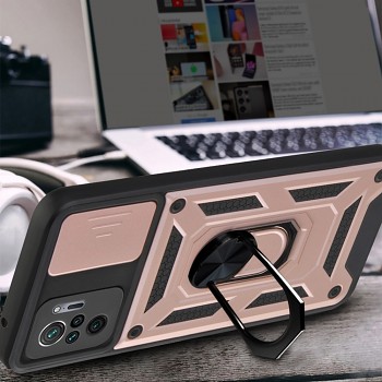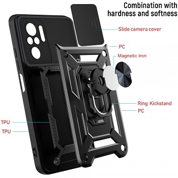 Jednou z hlavních předností je integrovaný posuvný kryt fotoaparátu (CamShield), který efektivně chrání čočky před poškrábáním a zároveň zajišťuje vaše soukromí. Tento kryt je navržen pro snadné a plynulé posouvání. Na zadní straně pouzdra naleznete praktický otočný prstenec (ring kickstand), který slouží jako stojánek pro pohodlné sledování obsahu v horizontální poloze. Prstenec se může otáčet o 360 stupňů a vyklápět o 110 stupňů, což umožňuje flexibilní nastavení úhlu. Navíc obsahuje magnetickou kovovou destičku, díky níž je pouzdro kompatibilní s magnetickými držáky do auta. Zesílená zadní část pouzdra s nárazuvzdorným okrajem dále zvyšuje celkovou ochranu telefonu.
