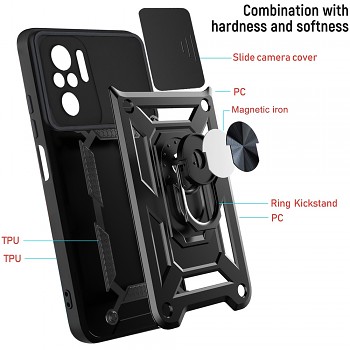 Dominantou designu je integrovaný posuvný kryt fotoaparátu (CamShield), který efektivně chrání citlivé objektivy před poškrábáním, prachem a zároveň zajišťuje vaše soukromí. Robustní vzhled s texturovanými panely a dekorativními prvky dodává pouzdru moderní a taktický vzhled, který zároveň zlepšuje úchop telefonu.